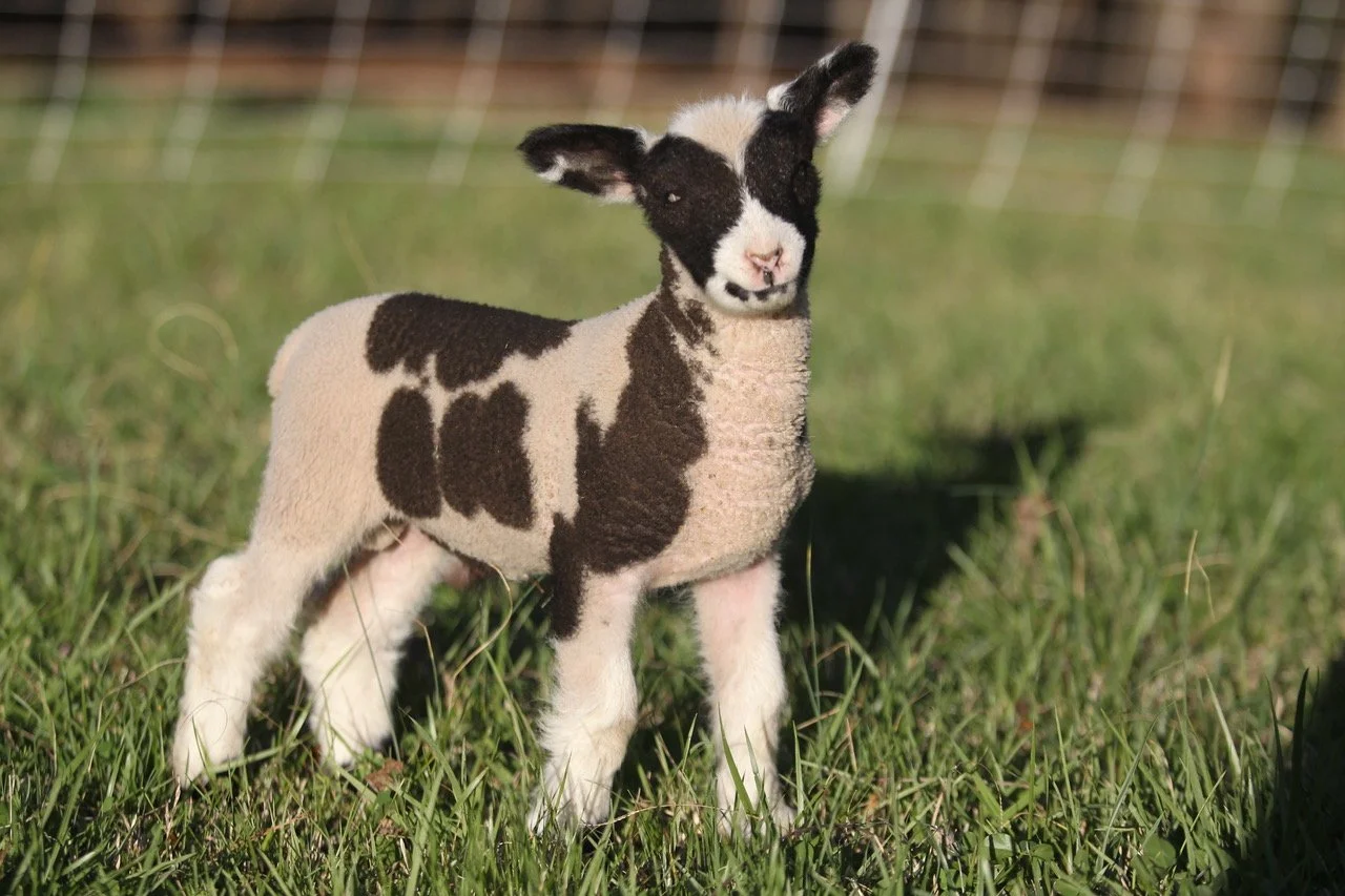 “Puddin”, A Generation Ram Lamb, Born March 19, 2026, Twin: Like his name suggests, Puddin is a sweet little guy who loves to have his chin scratched. His spots are almost merle in how they present around his neck and his partial blue eyes are framed in black with a white hourglass around his pink nose and forehead. His body is mostly white but with a dark saddle over his back. Puddin will make a great breeding ram.