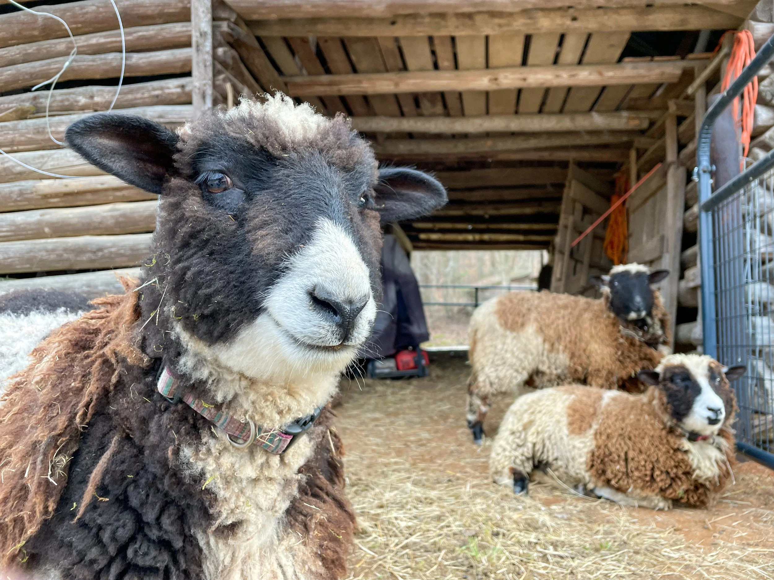 Three sheep with brown and white wool in front of a wooden barn, with the main sheep in the foreground wearing a collar.
