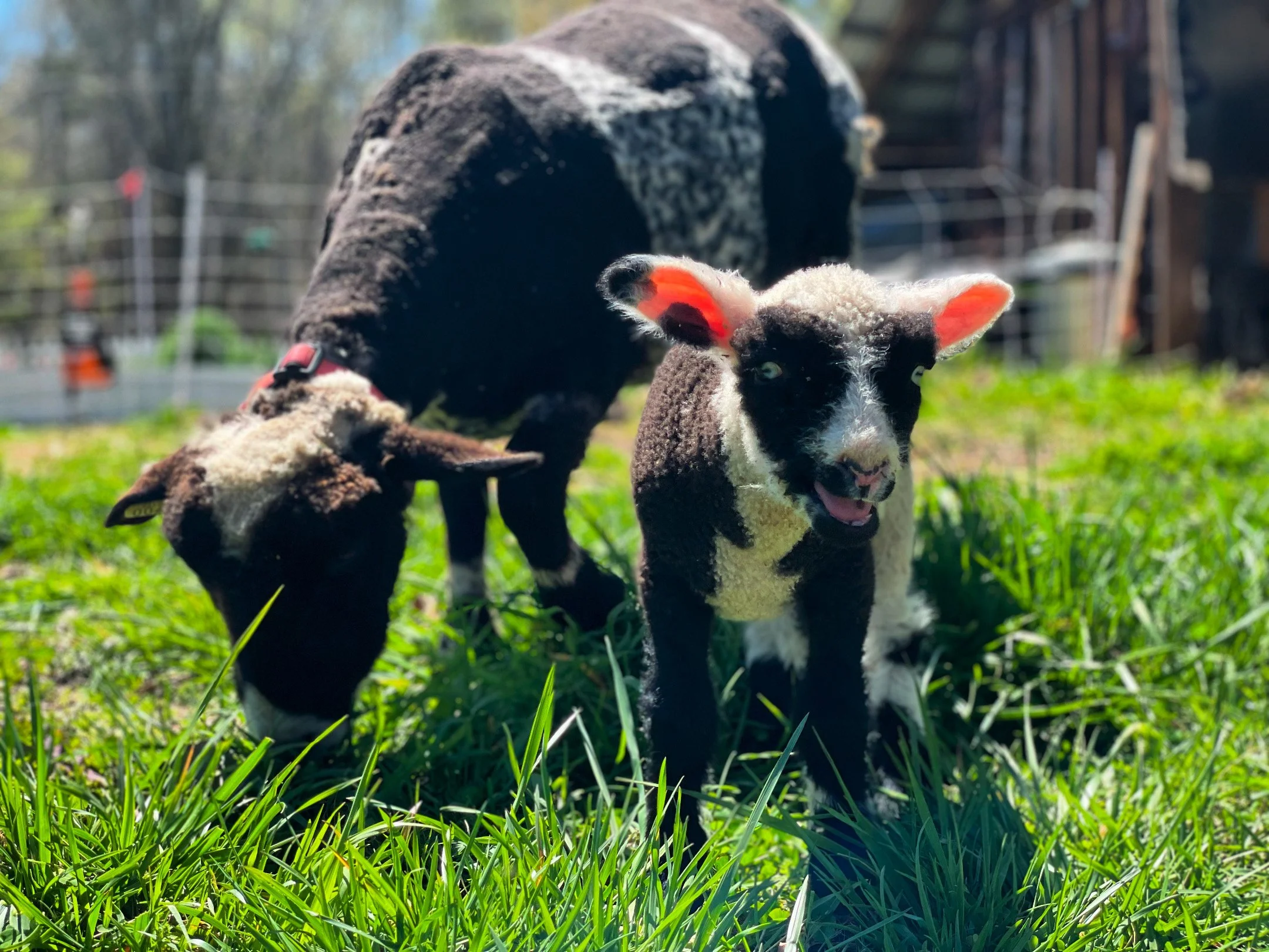 Two black and white lambs on a grassy field with a fence and trees in the background.